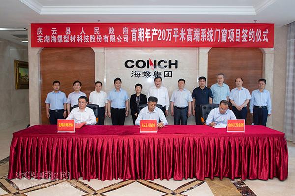 2020年6月2日,海螺型材與德州市慶云縣人民政府在海螺集團總部簽署了年產20萬平方米高端系統門窗項目協議。海螺集團黨委書記、董事長高登榜,集團副總經理、海螺型材董事長萬涌,集團紀委書記吳小明,德州市副市長張桂愛等出席并見證簽約儀式。海螺型材總經理王楊林、慶云縣縣長孫洪昌、山東慶投控股集團董事長王鐵峰現場簽約。
