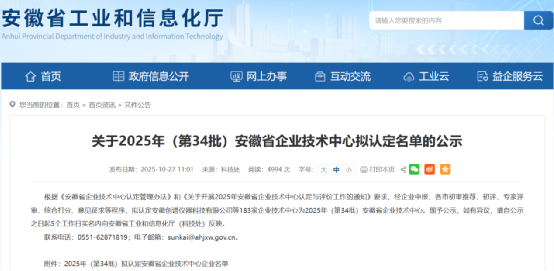 近日,安徽省工業和信息化廳公布了2025年(第34批)安徽省企業技術中心擬認定名單。安天利信憑借卓越的自主創新能力、持續的科技研發投入和完善的創新體制機制,成功入選。