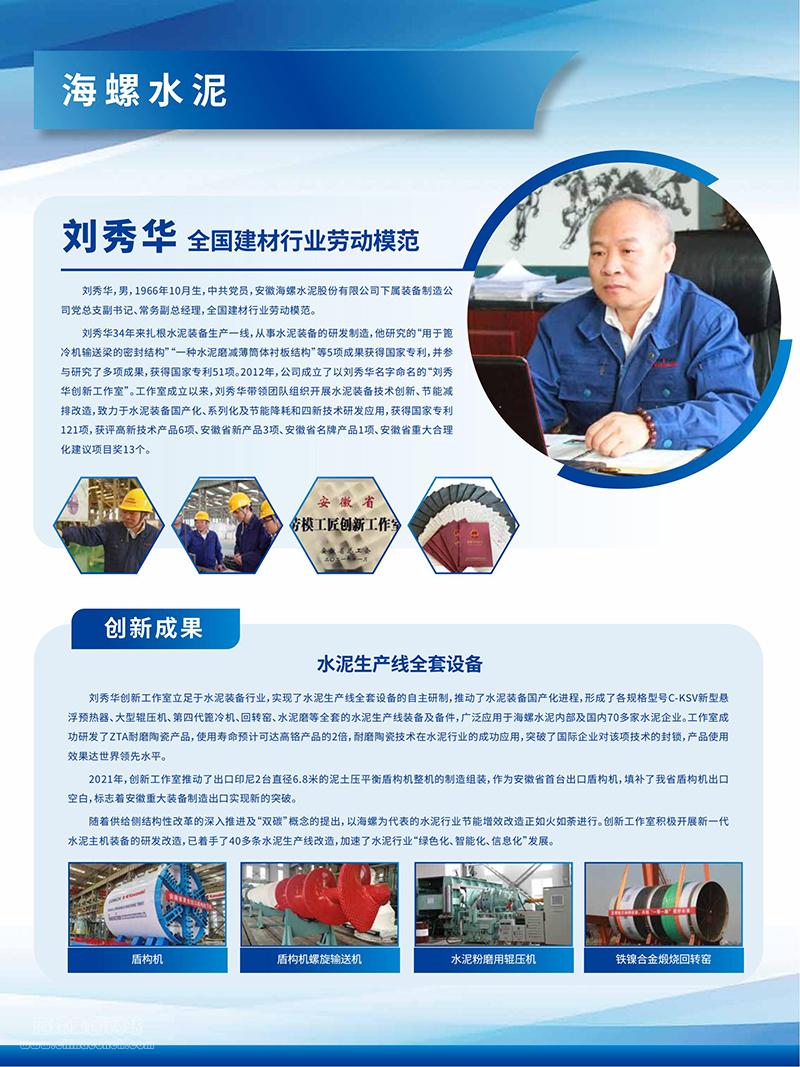 海螺水泥作為第二批全國產(chǎn)業(yè)工人隊(duì)伍建設(shè)改革試點(diǎn)單位,由安徽省總工會(huì)遴選了全國建材行業(yè)勞動(dòng)模范劉秀華、安徽工匠汪芳青2名同志的創(chuàng)新事跡及有關(guān)技術(shù)創(chuàng)新成果在安徽省總工會(huì)展區(qū)展出。
