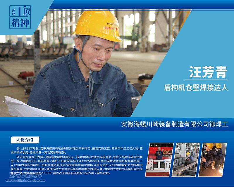汪芳青從事焊工20年,以精益求精的態(tài)度,從一名電焊學(xué)徒成長為高級(jí)技師,完成了各種高難度的焊接工程。他精湛技藝,勇挑重?fù)?dān),成為安徽省盾構(gòu)機(jī)倉壁焊接第一人,填補(bǔ)了安徽省自主制作盾構(gòu)機(jī)出口的空白;以國內(nèi)最高的焊縫一級(jí)標(biāo)準(zhǔn)成功完成盾構(gòu)機(jī)螺旋輸送機(jī)焊接,滿足長達(dá)21.23米螺旋狀葉片的高精度焊接要求,并成功出口日本。他是各種大型水泥裝備制作焊接的關(guān)鍵人才,焊接的大件成為海螺公司的支柱型產(chǎn)品,為海螺公司在“十三五”期間占有國內(nèi)外水泥裝備市場作出了突出貢獻(xiàn)。