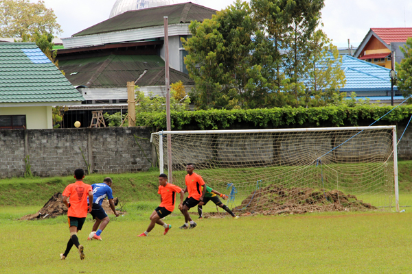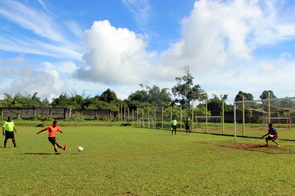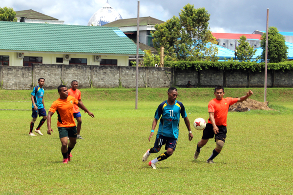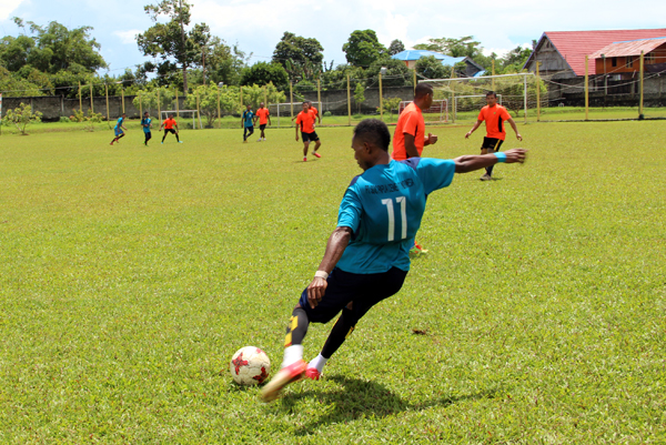 上午8:00,隨著主裁判劃破長空的一聲哨響,比賽正式開始。首先上場的是BRIMOB(武警總隊代表隊)和HINK(村民代表隊),只見哨響球動,對戰雙方全力廝殺開來。