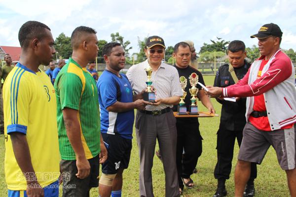 一波舞蹈高潮之后,首屆“海螺水泥杯”足球友誼賽總決賽拉開戰幕。經過緊張的爭奪,最終,PEMDA(縣政府代表隊)隊以5:1的絕對優勢,力克對手,奪得冠軍。