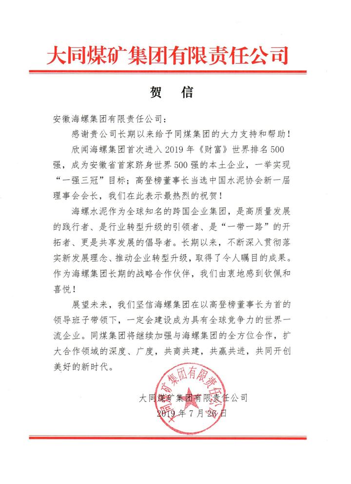 大同煤礦集團(tuán)致海螺集團(tuán)賀信